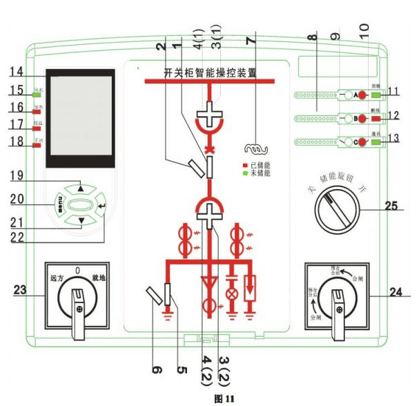 装置本身具有动态一次模拟图,带电显示及闭锁、电能参数测量、温湿度智能控制、断路器分合闸以及预分预合状态指示、储能指示、接地开关状态指示、手车位置指示、分合闸回路完好指示、人体红外感应(选配) 、语音防止误操作提示、远方/就地 操作、远程通信、柜内照明等功能。您若选配了高压带电体无线测温探头,还可进行多点带电体的无线测温(最多 12 点) 。