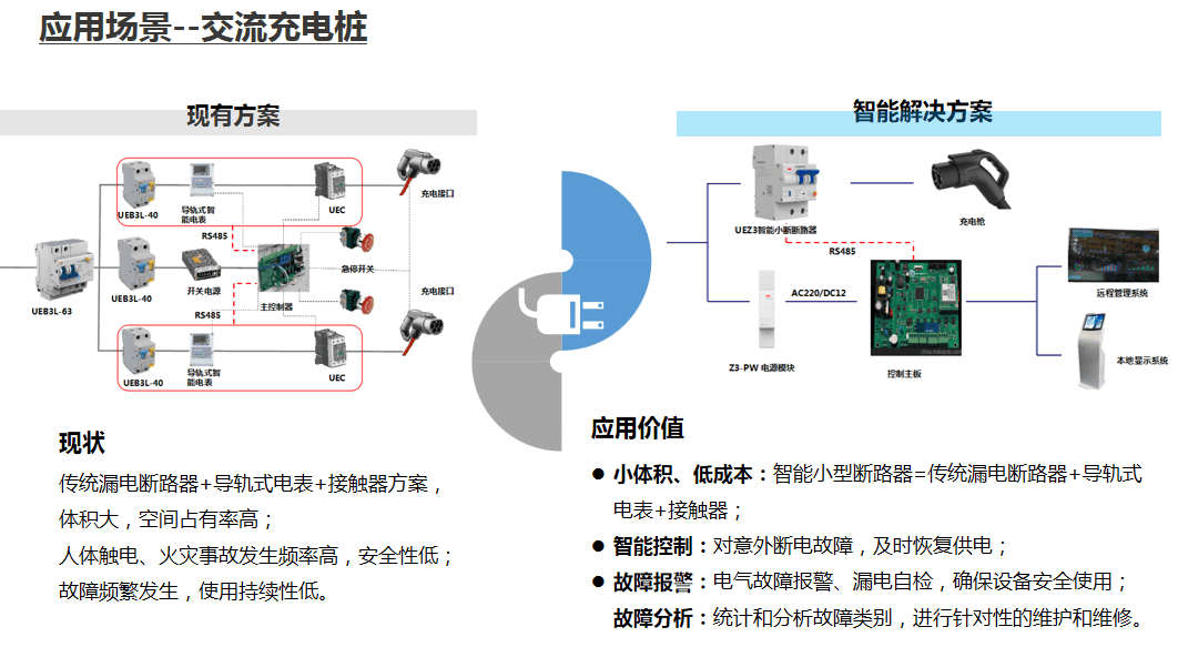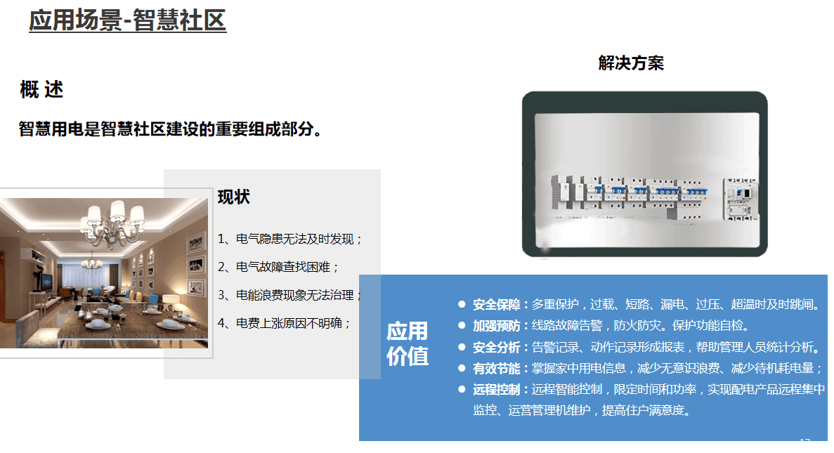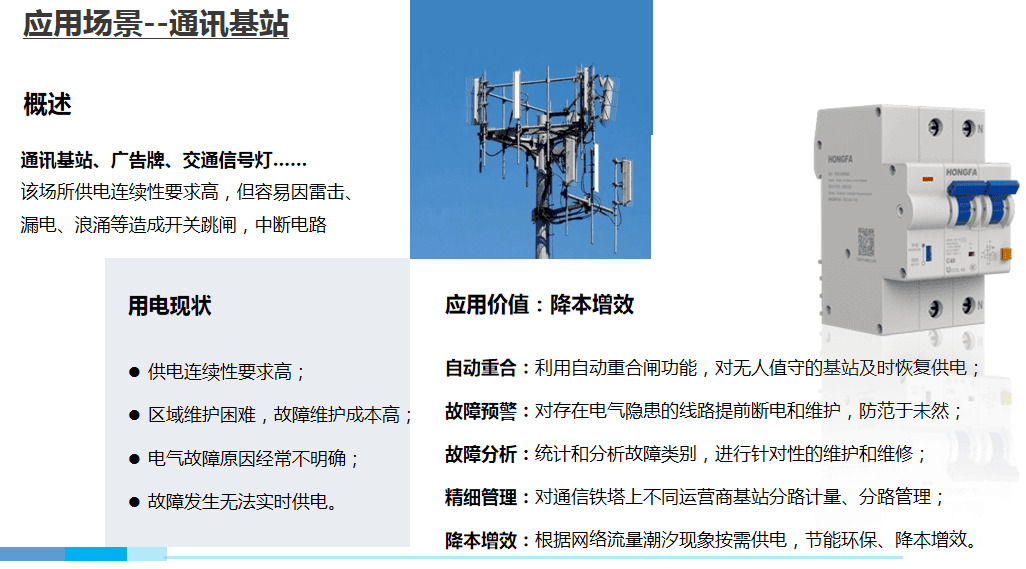 产品除具有传统断路器过载和短路保护功能外还有漏电保护、远程控 制、电参数计量、过欠压自恢复、故障分析、故障预警、RS485 通讯等功能;适用于交流50Hz,额定工作电压 230V/400V,额定工作电流至 63A 的线路中。广泛用于智能配电、视频监控、 通讯基站、数据中心、充电桩、智能家居、消防、安防等多种场所。