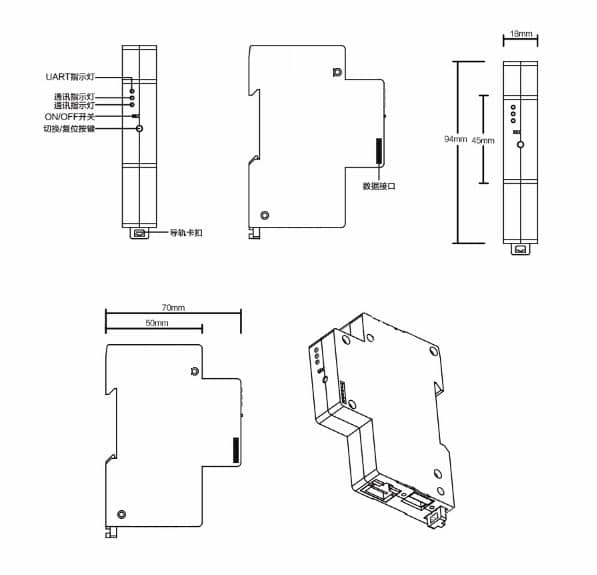 通讯主机 | 1. 支持双向互联网通讯; 2. 可支持以太网、WIFI、2G、4G、NB-IoT等多种通信方式; 3. 支持向下串口通讯功能、数据计算分析存储功能; 4. 工作电压:DC12V; 5. 工作环境:-5℃~45℃; 6. 安装地点海拔:不高于2000m; 7. 安装方式:导轨卡口。 |